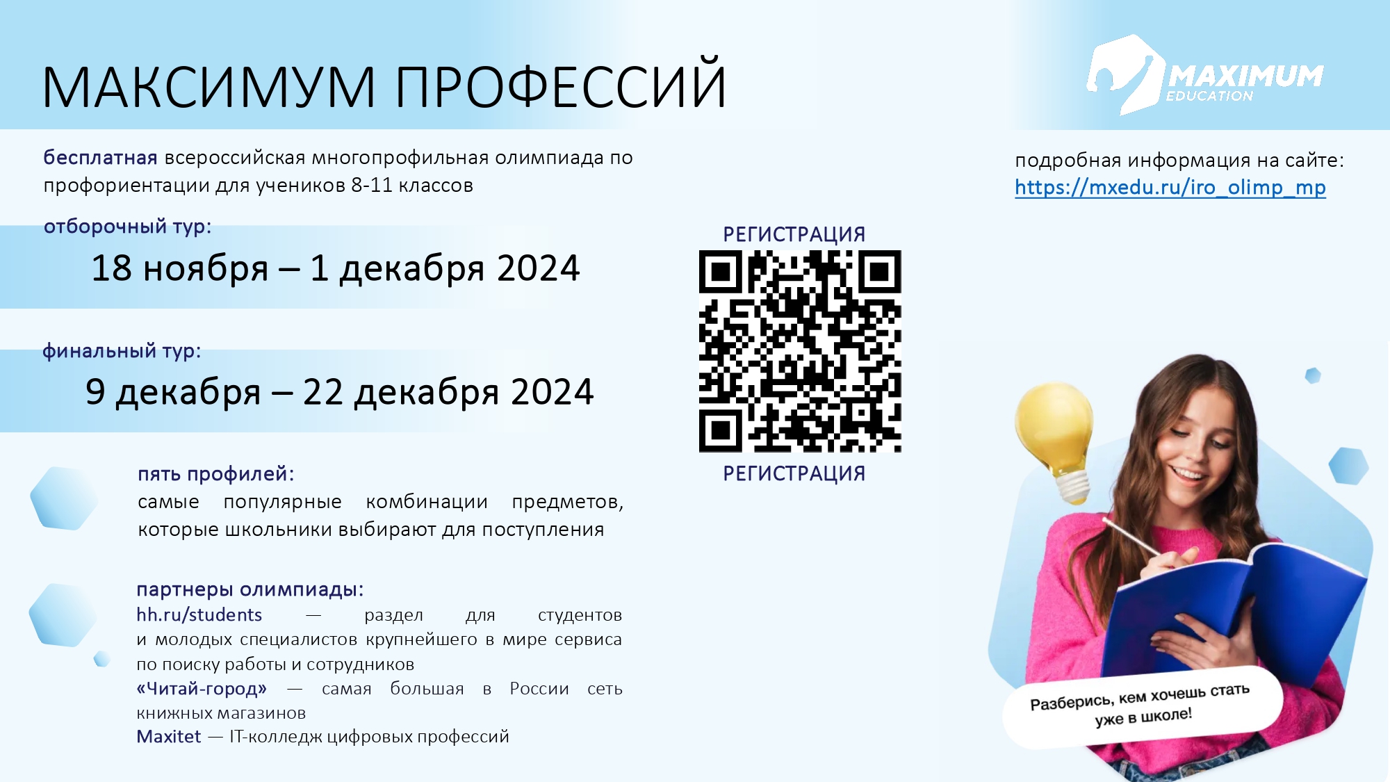 Участники олимпиады получат сертификаты, а победители — именные дипломы и подарки от партнеров «Максимума профессий». Чтобы принять участие в олимпиаде по профориентации, нужно зарегистрироваться.