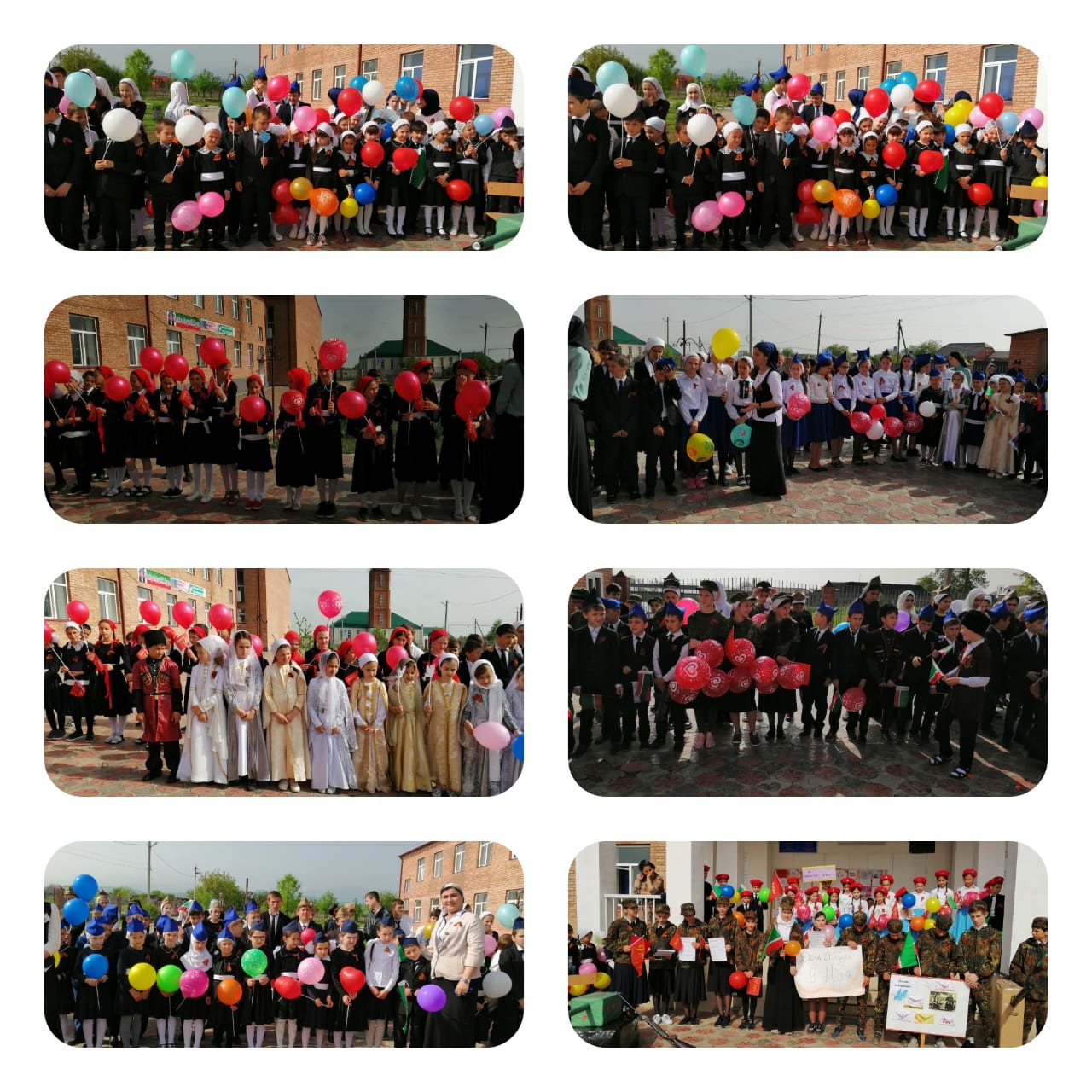 в школе проведено общешкольное мероприятие с учащимися 1-11 классов. К мероприятию был оформлен стенд с материалами о ВОВ, оформлена выставка детских рисунков " День Победы ", изготовлены макеты танка, пушки и написаны письма ветеранам войны. Учащимися 7 Б класса (кл.руковадитель Ампукаева Л.С.) показана литературно - музыкальная программа, содержащая информацию о важных событиях военного периода, Сыграна сценка о долге и чести мужчины. Учащимися 5 б класса был исполнен танец ,,Катюша" и мастерски сыгран мини-спектакль "Чеченцы на войне". Многие учащиеся начальных классов были одеты в национальные костюмы. В руках у детей цветы, шары, флажки, а на груди, у каждого присутствующего, - георгиевская ленточка. Каждый из учащихся был приобщён к важности и торжественности мероприятия.
